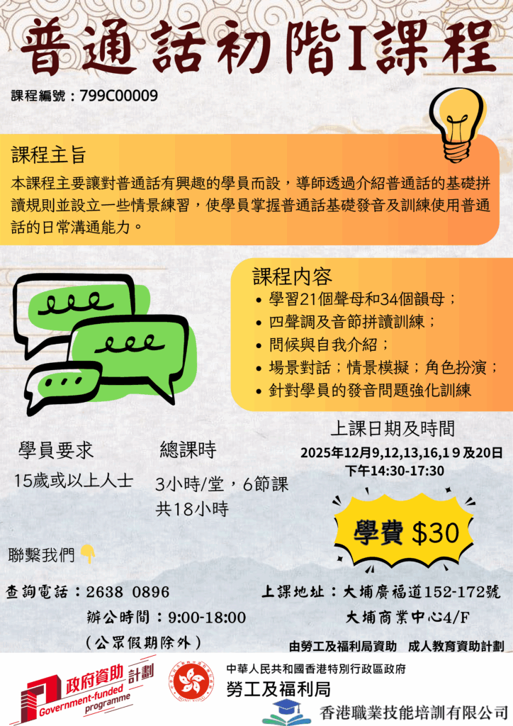 成人教育資助計劃-普通話初階I課程