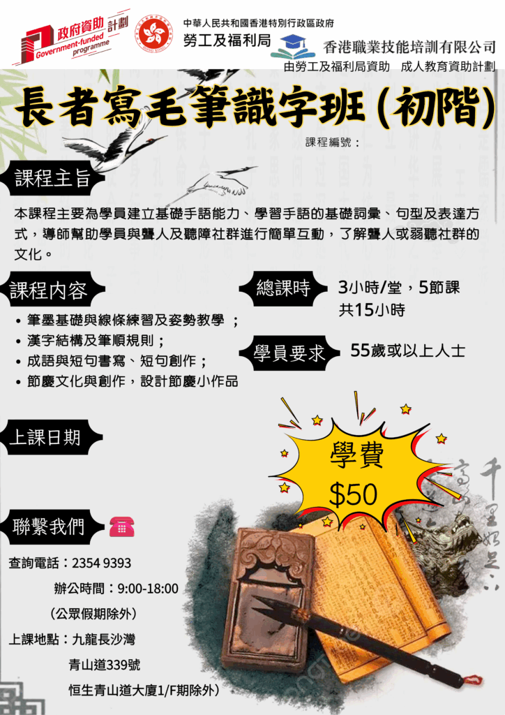 成人教育資助計劃-長者寫毛筆識字班 (初階)
